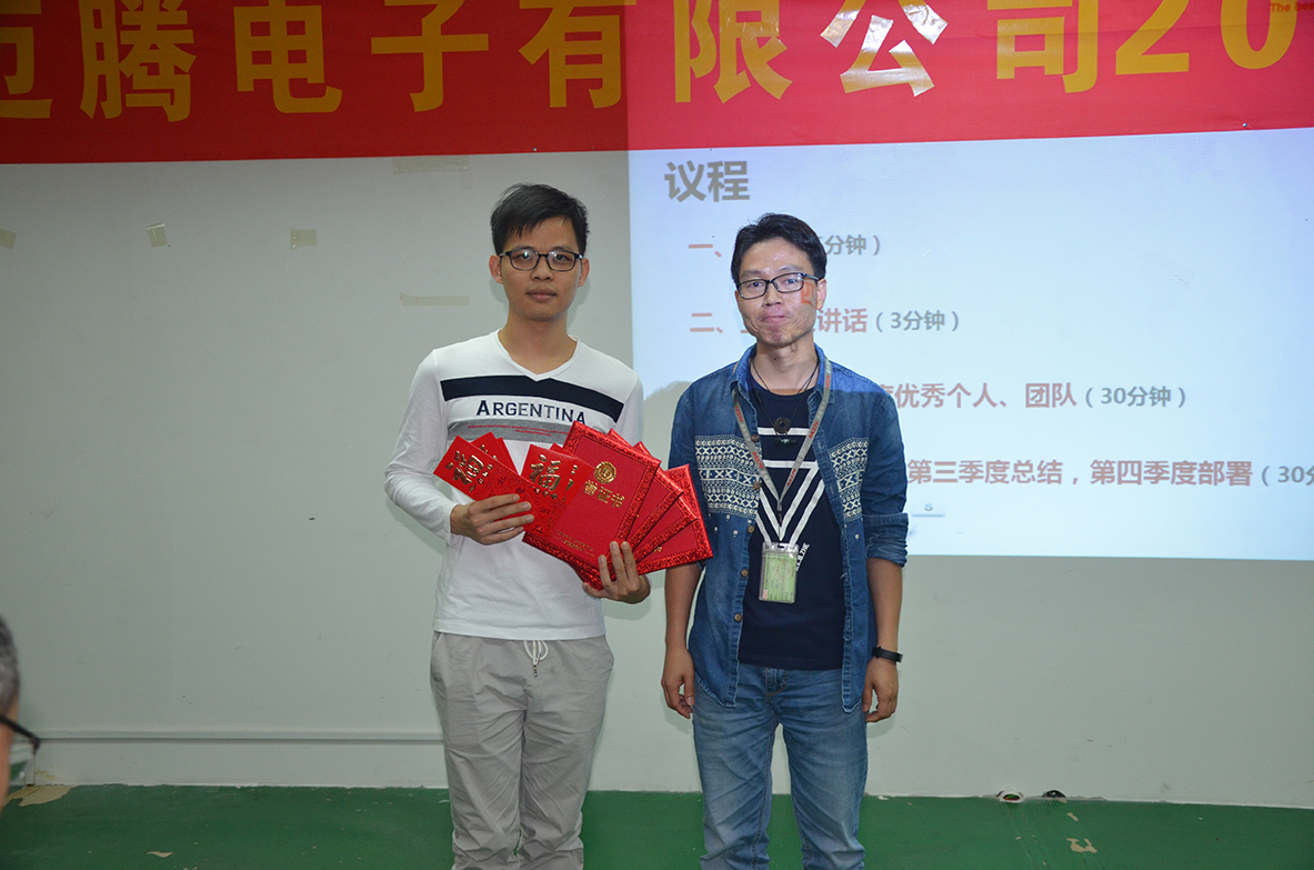 大会的结尾,黄总为营销中心总监欧总和产品线魏经理,准备了一件特别的礼物并亲自颁发,勉励他们继续发扬标杆和榜样的力量,并希望全体pg电子网站人认真学习他们的先进事迹,进一步加强个人能力及团队协作能力,不断满足客户需求,为实现pg电子网站电子成为世界一流的研发、制造厂商而努力!